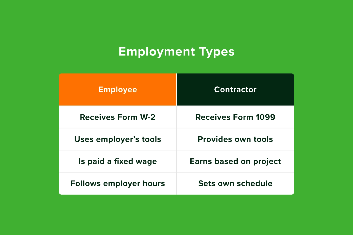 Contractors invoice you for their services, pay their own taxes, and aren’t covered by the same laws that apply to employees. You’re not responsible for benefits, unemployment insurance, or payroll tax withholding.